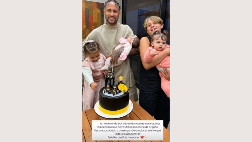 Neste último domingo (10), Dia dos Pais, Bruna Biancardi usou suas redes sociais para parabenizar Neymar Jr. com uma mensagem afetuosa. A influenciadora compartilhou uma foto do jogador ao lado de seus quatro filhos e destacou o quanto admira o papel dele como pai.