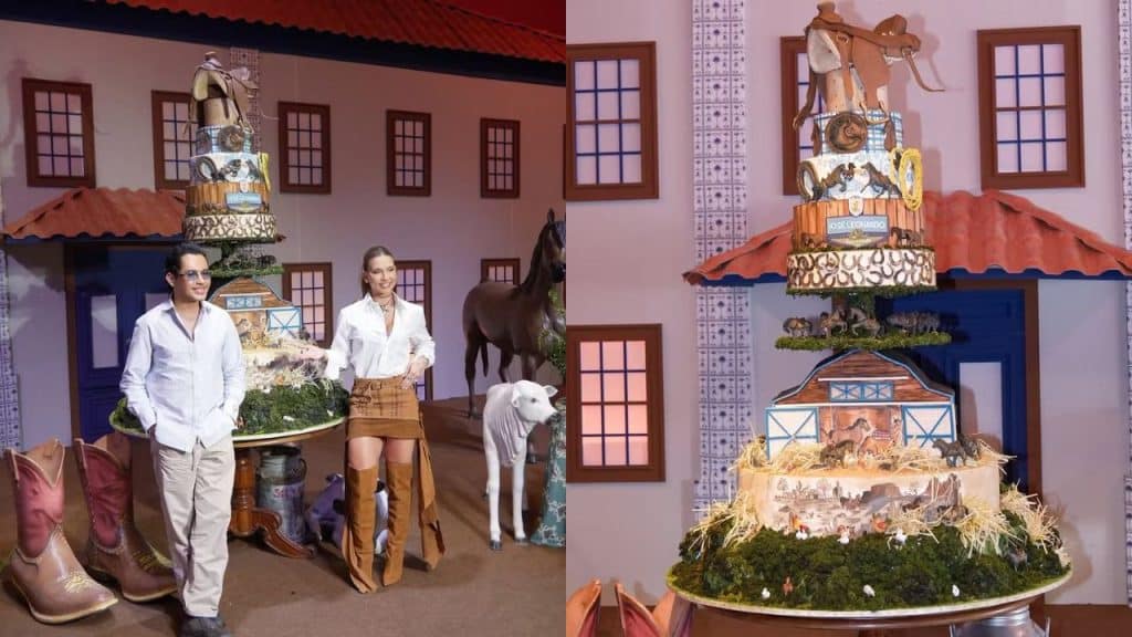 Toda a estrutura foi feita com materiais comestíveis e inspirada no universo rural: cavalos, vacas, casa de campo e até um monumento feito em açúcar fizeram parte da decoração. “A estrutura imponente traz cavalos, vacas e elementos do campo em açúcar, incluindo uma casa e um monumento que traduziram a essência da festa”, detalhou.
