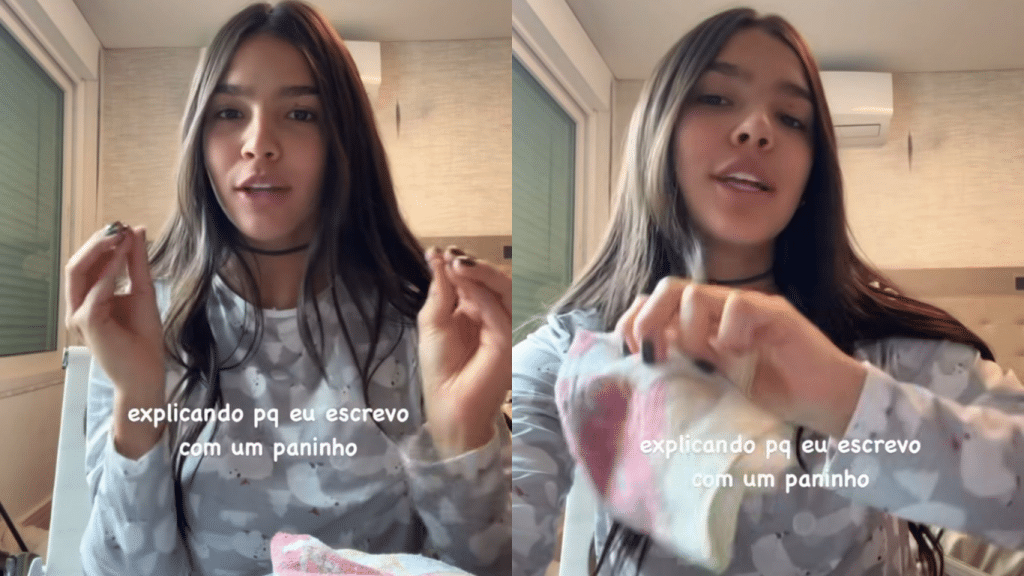 Para conseguir escrever sem dificuldades, a influenciadora desenvolveu uma solução prática. “E aí eu aprendi a escrever em cima de um paninho, eu apoio minha mão nele e escrevo, assim a folha não molha. Eu faço isso a minha vida inteira”, contou.