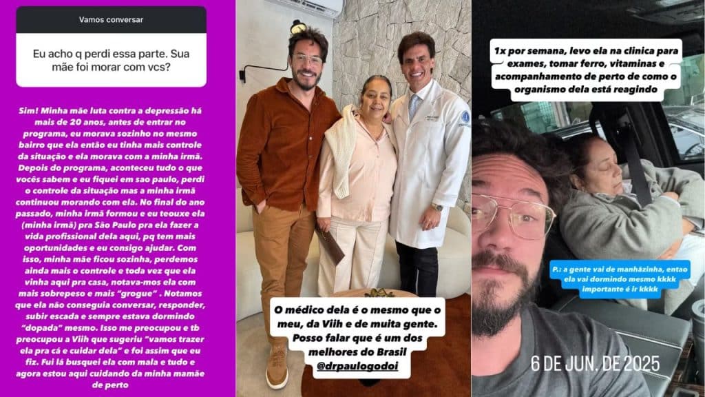 Eliezer contou que a mãe convive com a depressão há mais de 20 anos. Antes da fama, ele morava no mesmo bairro que ela, o que facilitava os cuidados. Com a mudança para São Paulo, após o Big Brother Brasil, a distância virou um desafio. A irmã dele ficou com a responsabilidade por um tempo, mas, ao se formar no final do ano passado e mudar de cidade para investir na carreira, a mãe acabou ficando sozinha.