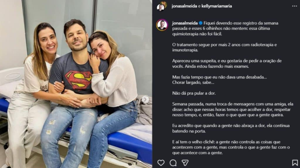 Jonas iniciou o vídeo agradecendo o carinho do público e revelou que a última sessão de quimioterapia foi particularmente desafiadora. “Fiquei devendo esse registro da semana passada e esses 6 olhinhos não mentem: essa última quimioterapia não foi fácil. O tratamento segue por mais 2 anos com radioterapia e imunoterapia. Apareceu uma suspeita e eu gostaria de pedir a oração de vocês. Ainda estou fazendo mais exames”, contou o jornalista, visivelmente emocionado.