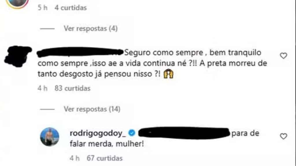 Na foto postada, Rodrigo aparece aparentemente sereno. A legenda breve dizia apenas: “Firme e seguro”. A frase, interpretada por muitos como insensível, foi o estopim para comentários críticos de internautas. Um deles escreveu: “Seguro como sempre, bem tranquilo como sempre, isso aí, a vida continua, né? A Preta morreu de tanto desgosto, já pensou nisso?”.