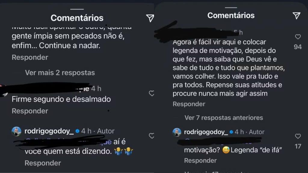 Outros comentários seguiram o mesmo tom crítico. Um seguidor apontou: “Agora é fácil vir aqui e colocar legenda de motivação, depois do que fez. Mas saiba que Deus vê e sabe de tudo”. O ex-marido respondeu com ironia: “Motivação? Legenda ‘de ifá’”.