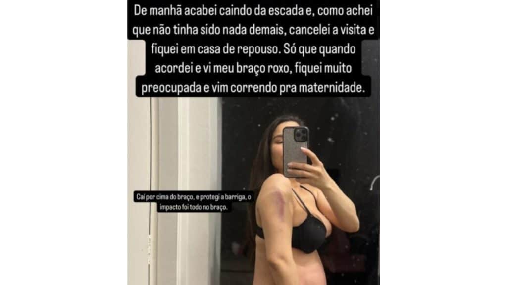 “Caí por cima do braço e protegi a barriga, o impacto foi todo no braço”, explicou. Prioridade total no bebê, claro. Mesmo com o machucado, ela ficou aliviada ao saber que tudo estava aparentemente bem com ela e com o pequeno que está a caminho.