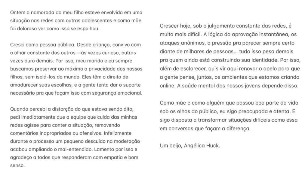 Diante da pressão, Angélica resolveu se pronunciar. Em uma carta aberta publicada em suas redes, explicou que sempre procurou manter sua vida pessoal longe dos holofotes e que a curtida polêmica foi, na verdade, um erro da equipe que cuida de seu perfil.