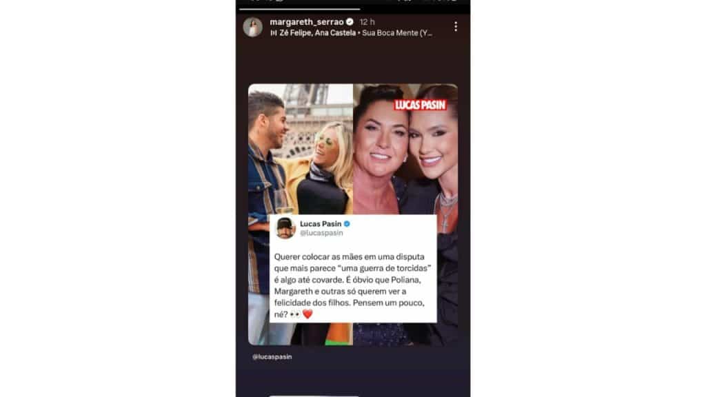 A mãe de Virginia também republicou no Instagram um tweet de um jornalista que criticava a tentativa de colocar as mães em lados opostos, como se houvesse uma disputa entre elas. “Querer colocar as mães em uma disputa que mais parece uma ‘guerra de torcidas’ é algo até covarde. É óbvio que Poliana, Margareth e outras só querem ver a felicidade dos filhos. Pensem um pouco né?”, disse o jornalista na publicação repostada pela mãe de Virginia.”, comentou o jornalista.