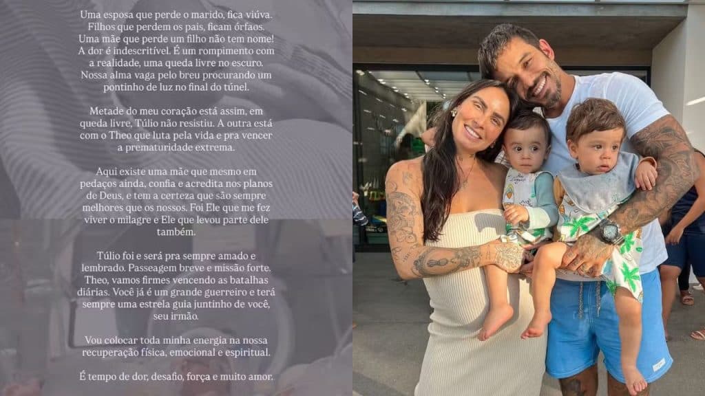 “Túlio foi e será pra sempre amado e lembrado. Passagem breve e missão forte. Theo, vamos firmes vencendo as batalhas diárias. Você já é um grande guerreiro e terá sempre uma estrela guia juntinho de você, seu irmão. Vou colocar toda minha energia na nossa recuperação física, emocional e espiritual. É tempo de dor, desafio, força e muito amor. De quem ama vocês mais que tudo, mamãe.”
