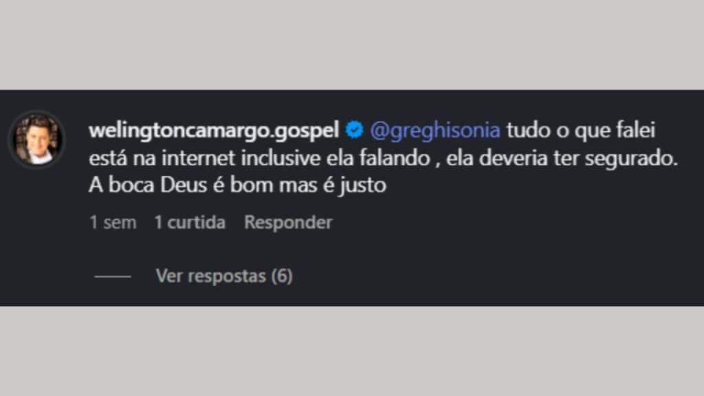 Em meio aos inúmeros comentários negativos, Welington decidiu rebater algumas mensagens. Ele justificou suas palavras alegando que as declarações de Preta Gil estão disponíveis online: “Tudo o que falei está na internet, inclusive ela falando. Ela deveria ter segurado a boca. Deus é bom, mas é justo.”