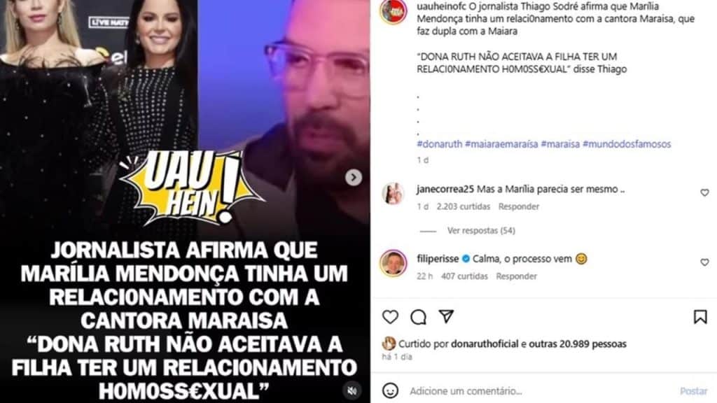 Ainda durante o bate-papo, Thiago Sodré deixou escapar o nome da pessoa que supostamente teria se envolvido com Marília: a cantora Maraisa. Companheiras inseparáveis no palco e fora dele, a amizade das duas sempre chamou atenção pela intensidade e cumplicidade.