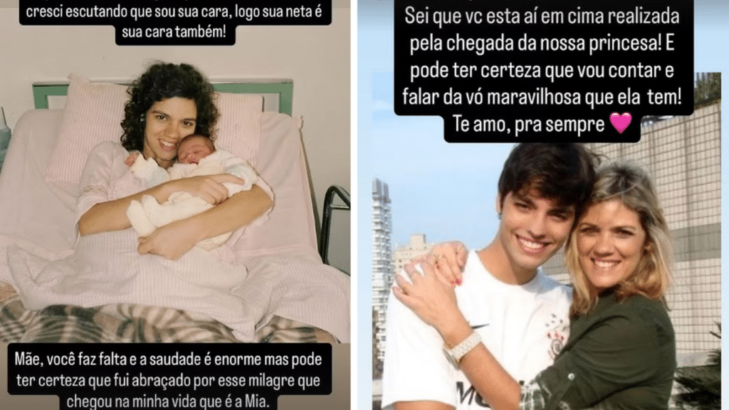 O post também incluiu fotos de quando ele era criança ao lado da mãe e outra já adulto, comparando com Mia. “Mãe, olha como Deus está presente nos mínimos detalhes! Fui presenteado com essa princesa que tem os olhinhos rasgados, o narizinho redondo e a boquinha desenhada igual quando eu nasci”, declarou.