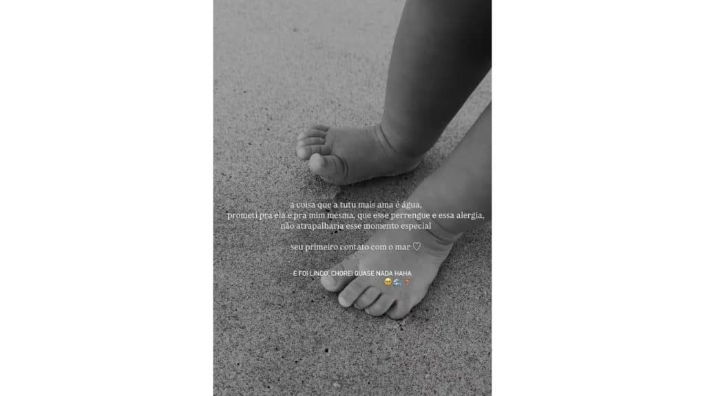 “A coisa que a Tutu mais ama é água. Prometi para ela e pra mim mesma que nesse perrengue e essa alergia não atrapalharia esse momento especial: seu primeiro contato com o mar. E foi lindo, chorei quase nada”, relembra Amanda, emocionada.