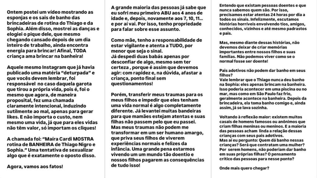 Em outro trecho do desabafo, Maíra compartilhou sua própria história de abusos, revelando que os primeiros ocorreram aos 4 anos de idade, e se repetiram em diversas fases da infância. “Por isso, tenho propriedade para falar sobre esse assunto. Como mãe, tenho a responsabilidade de estar vigilante e atenta a TUDO, por menor que seja o sinal”, afirmou.