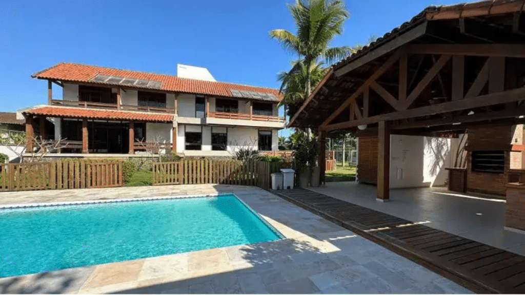Com área construída de 1.000 metros quadrados, o imóvel oferece muito espaço e conforto. São cinco suítes, sete banheiros no total, piscina com deck, área gourmet com churrasqueira, um jardim extenso, campo de futebol e até uma garagem com capacidade para seis veículos.