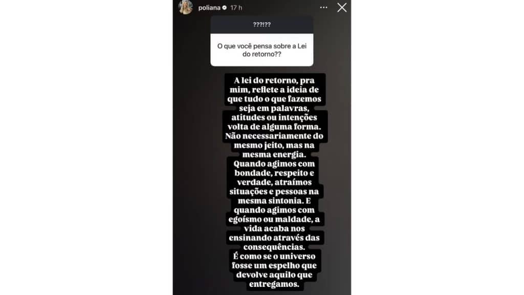 Enquanto o público ainda reagia ao fim do casal, Poliana Rocha, de 48 anos, publicou em seus stories uma mensagem sobre o conceito da lei do retorno, também conhecido como karma. Na publicação, ela destacou que tudo o que emitimos, seja em palavras, ações ou pensamentos, volta com a mesma vibração.