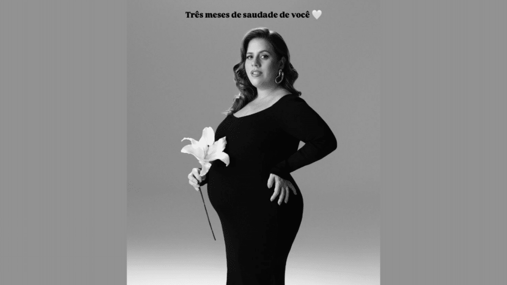 No clique, Tati aparece usando um vestido preto e segurando uma flor branca em frente ao barrigão. Na legenda, deixou um recado curto, mas cheio de sentimento: “Três meses de saudade de você”, acompanhado por um emoji de coração branco.