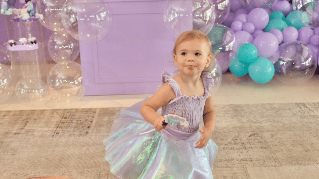 A pequena Ella encantou os presentes com um traje exclusivo, pensado especialmente para ela. Em sua tonalidade favorita, o lilás, o look incluía também nuances que remetem ao fundo do mar, como lavanda furta-cor e verde-água. A combinação trouxe à festa um clima de fantasia e doçura, típico do universo infantil.