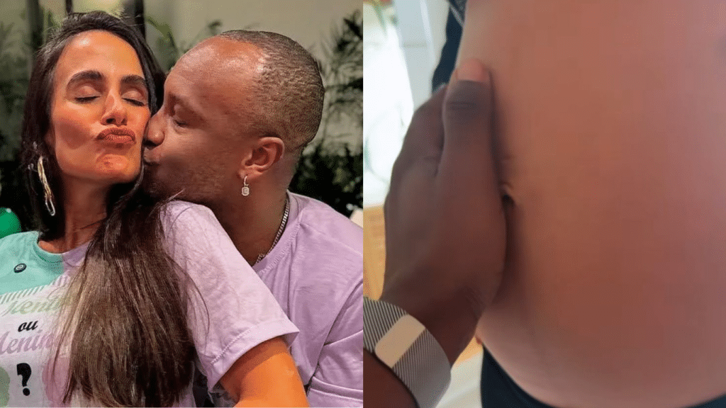 Logo ao chegar, Thiaguinho correu para fazer carinho na barriga da esposa, que já está no sexto mês de gestação. Entre beijos e risadas, ele celebrou o momento em um vídeo cheio de afeto: