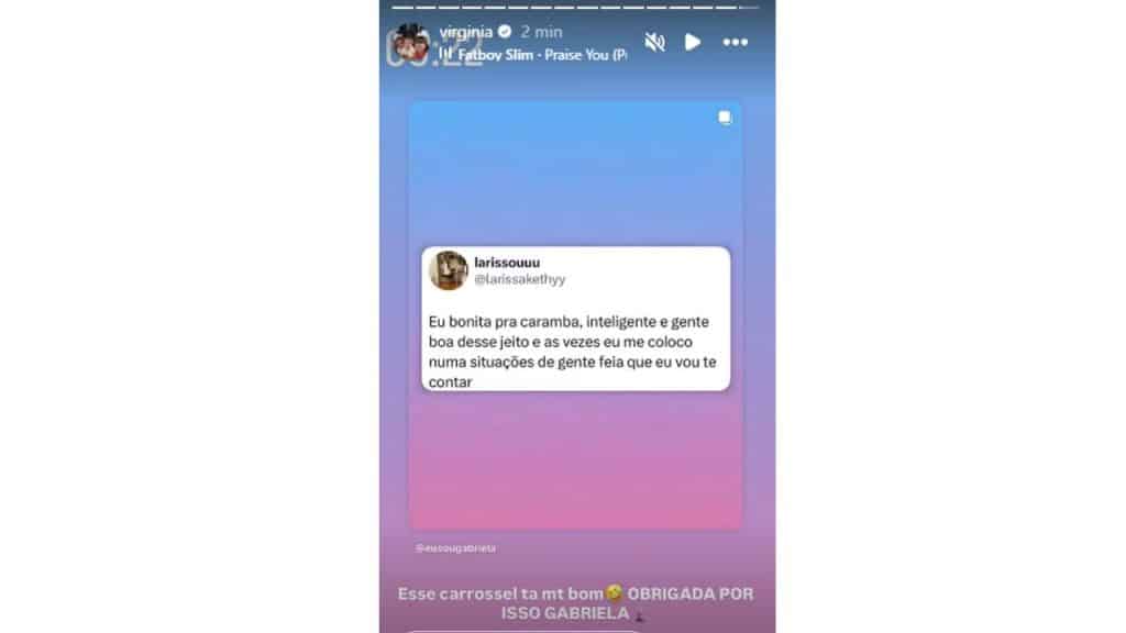 Ao voltar de viagem, Virginia exibiu alguns momentos com os filhos frutos do seu antigo relacionamento com Zé Felipe, mas o que realmente chamou atenção foi um carrossel que ela repostou com algumas frases sugestivas. “Eu, bonita pra caramba, inteligente e gente boa desse jeito e às vezes me coloco numas situações de gente feia que vou te contar”, dizia o post. Além desta frase, o carrossel continha outras frases que poderiam ser entendidas como indiretas sobre os últimos acontecimentos de sua vida.