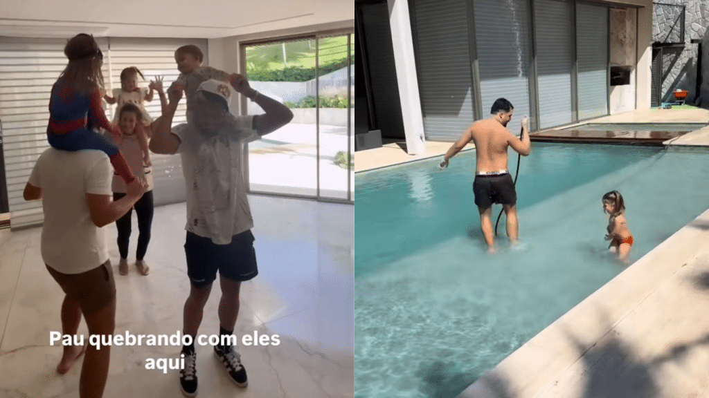 Em outro momento compartilhado nos stories, Lucas foi filmado dançando com Maria Alice e Maria Flor na área da piscina, aproveitando o sol de Goiânia. As imagens mostram o clima leve e cheio de risadas entre os amigos e as crianças.