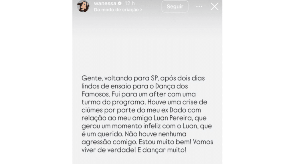 Wanessa se pronunciou na sexta-feira (22) em suas redes sociais, após a jornalista Fábia Oliveira noticiar que Dado a teria agredido em um bar. A artista negou a informação e esclareceu que o episódio foi motivado por ciúmes do ator, a quem chamou de “ex”. Posteriormente, Dado afirmou que os dois estavam juntos.