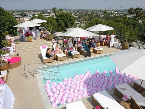 Tori Spelling substituiu os balões de festa por bolas de praia que enfeitaram a sua piscina, ficou lindo, e se você não tem um espaço assim tão amplo para o seu chá de bebê, pode também tentar uma versão reduzida, usando um tanque de água, com mini bolas imitando as de praia, para enfeitar a mesa do bolo.