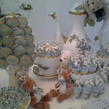 Cláudia Leite também teve uma idéia bastante criativa para a mesa do seu chá de bebê, ela explorou a idéia do chá e decorou a mesa dos doces com xícaras e bules tamanho família.