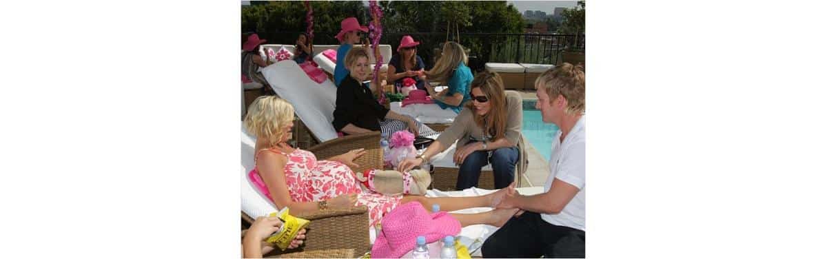 Tori Spelling contratou massagistas para o seu chá de bebê, eles não só aliviam o típico inchaço nos pés, bastante freqüente entre as grávidas, mas também traz um ar de sofisticação à comemoração.
