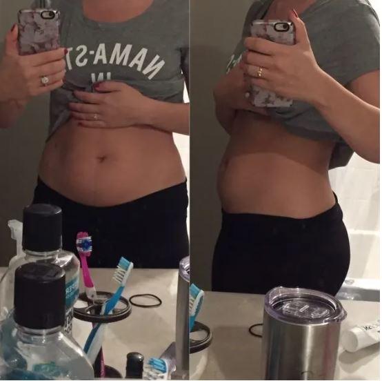 “As fotos da esquerda foram tiradas dois dias antes da minha cesariana. As da direita foram tiradas dois dias depois. Parecia que tinham costurado meu estômago e meus peitos eram fontes intensas de leite”.