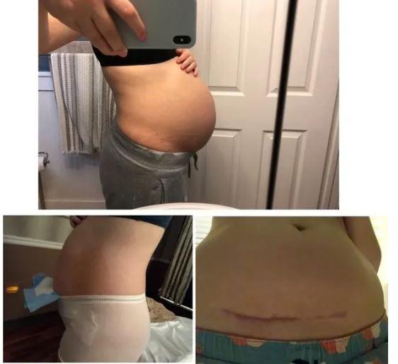 “A foto de cima foi tirada uma semana antes de dar à luz, a parte inferior esquerda foi tirada um dia depois. A foto da parte inferior direita mostra uma infecção horrível que eu tive depois da minha cesárea, então a cicatriz está bem feia”.