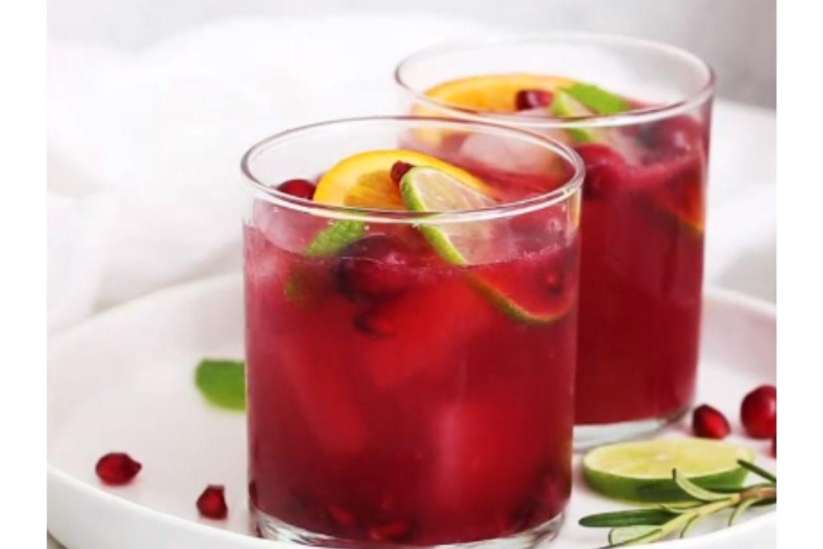 Coloque o gelo no copo e depois acrescente o suco de romã, laranja e limão. Misture até ficar homogêneo. Por último, acrescente a água com gás. Se quiser, use sementes de romã e rodelas de limão e laranja para decorar.