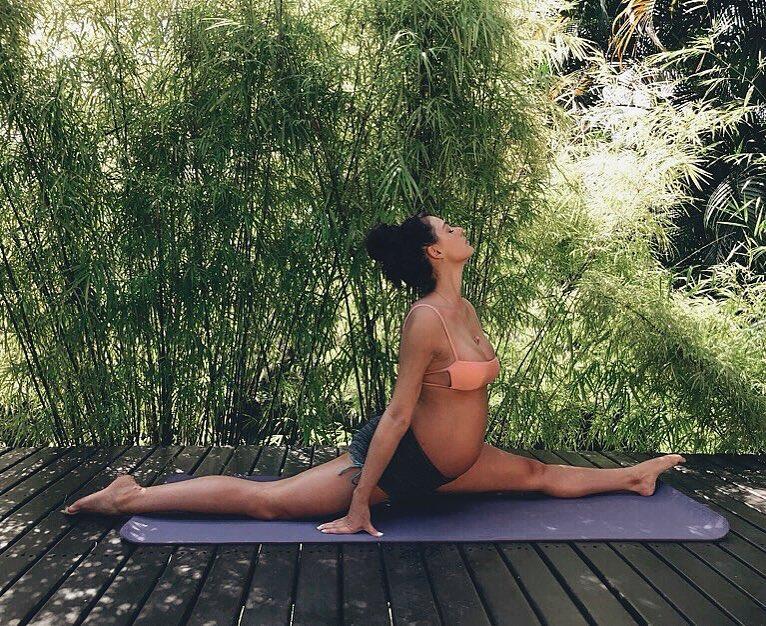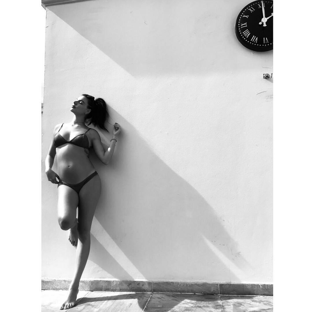 Com 27 semanas de gestação, a atriz também publicou uma foto de biquíni exibindo a barriga. “A gente tá na estrada mas pensando nos dias de sol! Eu e meu pequeno Rael! #27weeks #vemmeumenino #maedemenino #sunkiss #7monthspregnant”, escreveu na legenda.