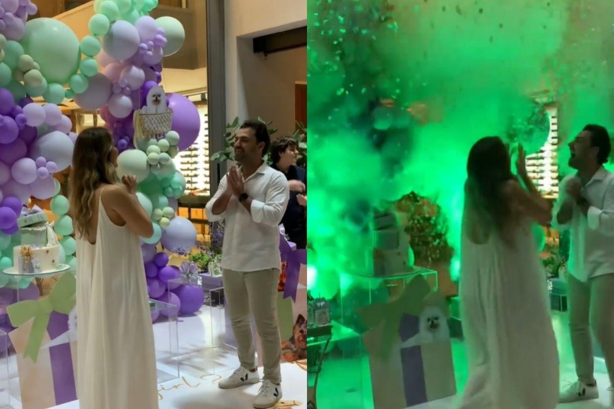 Em seu perfil do Instagram, Lyandra publicou um vídeo do chá revelação. Na postagem, ela aparece usando um vestido branco longo e soltinho ao lado do marido, Lucas Santos. A decoração foi feita em tons de verde e lilás e contava com imagens de Lulus da Pomerania dentro de cestos.