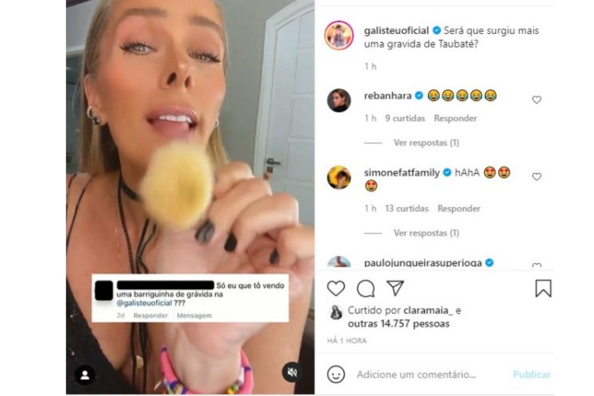 Nos comentários, os internautas reagiram ao vídeo. “Linda, hahahahaha, sempre com um humor ótimo”, disse um. “hahahahahahaha, só você mesmo né galisteu!”, brincou outro. “Amariaaa um novo bebê galisteu, seria uma dádiva”, opinou um terceiro seguidor.