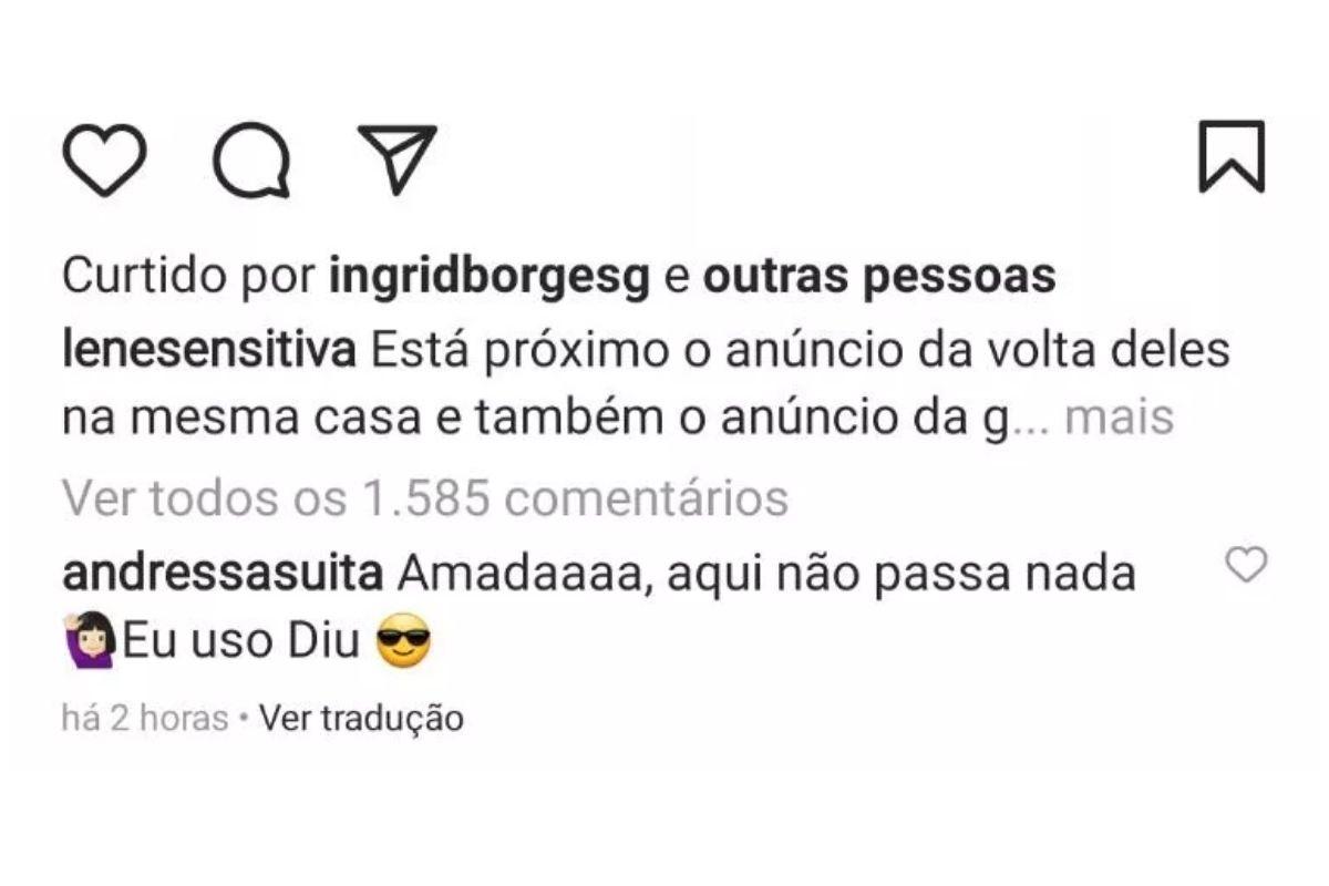 A publicação da página Lene Sensitiva dizia: “Está próximo o anúncio da volta deles e também o anúncio da gravidez dela”. Bem-humorada, Andressa Suita desmentiu a nova gestação e brincou: “Aqui não passa nada. Eu uso diu”.