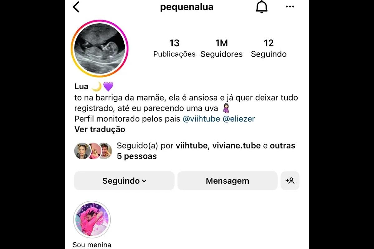 Lua, filha de Viih Tube, de 22 anos, e Eliezer, de 32 anos, alcançou nesta terça-feira, 18 de outubro, a marca de 1 milhão de seguidores em seu Instagram. A bebê, que ainda está sendo gestada, tem a rede social gerenciada pelos pais, que compartilham registros desde o descobrimento da gravidez.”Tô na barriga da mamãe, ela é ansiosa e já quer deixar tudo registrado, até eu parecendo uma uva”, é a bio do perfil. Nos destaques, “sou menina” reúne todos os Stories do chá revelação, que aconteceu neste domingo, 16 de outubro.