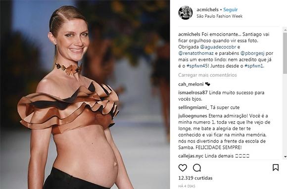O destaque da semana foi a modelo Ana Claudia Michels, que desfilou para a marca Água de Coco grávida de seis meses de Santiago, seu segundo filho. Em sua conta no instagram, a top escreveu: “Foi emocionante… Santiago vai ficar orgulhoso quando vir essa foto”.