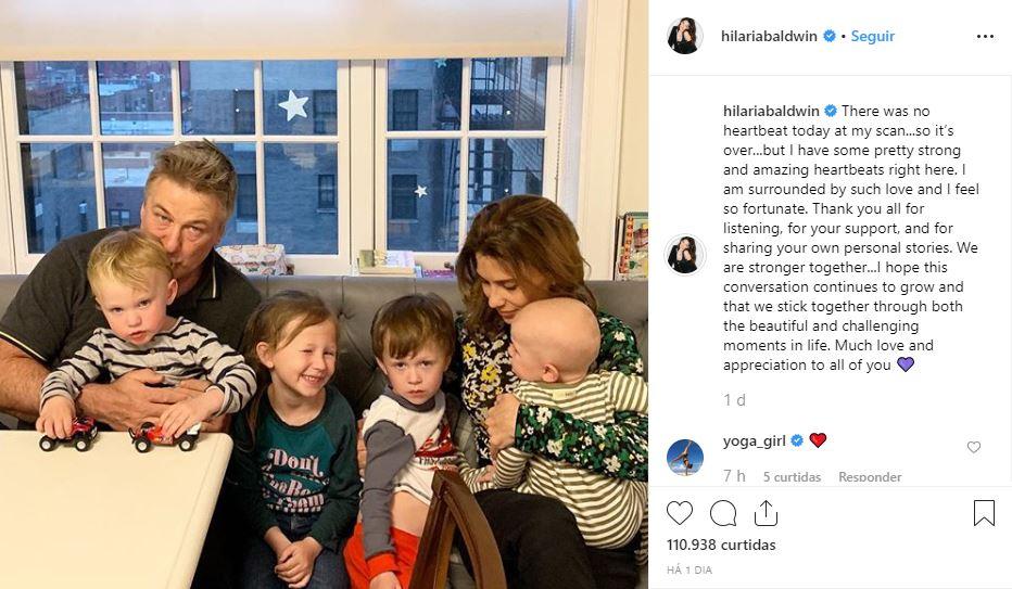 No post acima, Hilaria revelou que, durante um ultrassom, revelou que não ouviu os batimentos cardíacos do filho. “Não havia batimentos no meu ultrassom, então acabou… Mas tenho alguns batimentos cardíacos ao meu redor que são incríveis”, referiu-se aos quatro filhos. “Obrigada a todas as mulheres que compartilharam suas experiências, juntas somos mais fortes”, ela desabafou.