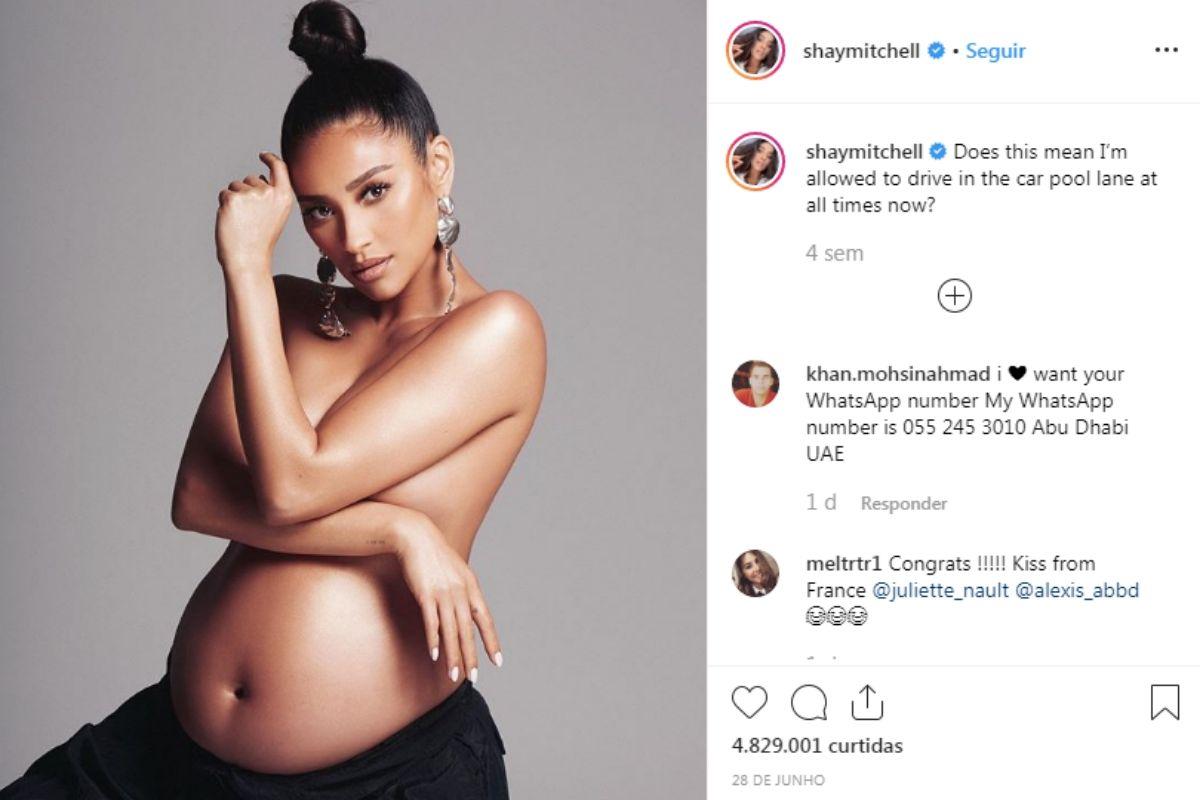 Sem medo algum, a atriz mostra sua fralda (Foto: Reprodução/ Instagram @shaymitchell)