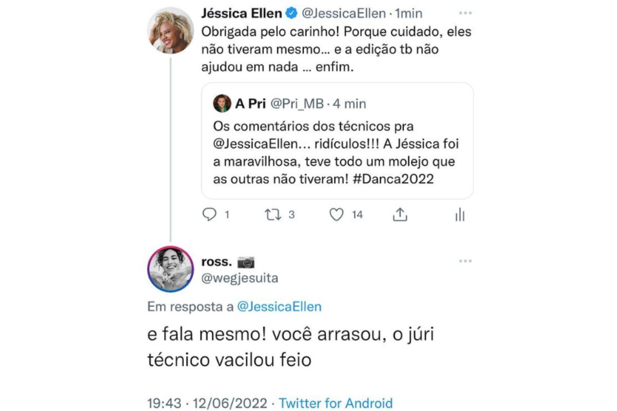 Depois do programa, a atriz compartilhou um comentário de um internauta que não gostou da atitude dos júris: “Impressionante a falta de sensibilidade com uma mulher grávida! Imagine o Carlinhos de Jesus dizer que sentiu falta da energia da Jéssica! Meu filho, você sabe o que é enjoo na gravidez? Que horror foi isso, procurar defeitos onde não tinha! A Jéssica Ellen foi perfeita”, dizia o comentário.
