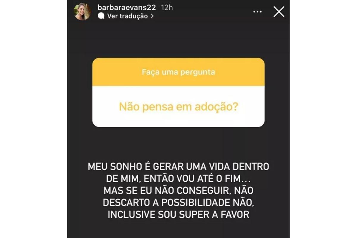 Bárbara Evans mandou a real sobre a possibilidade de adotar uma criança caso o processo de fertilização in vitro. No Instagram, a modelo conversou com seguidores sobre a realidade do procedimento – e abriu o jogo sobre o futuro.