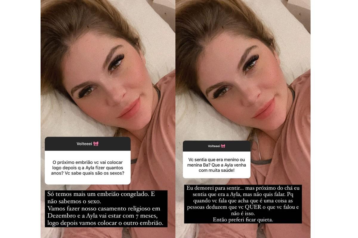 Na sequência, ela contou que não sente enjoos e que deseja fazer uma cesárea. Ao ser questionada: “O próximo embrião você vai colocar logo depois que a Ayla fizer quantos anos? Você sabe quais são os sexos?”, respondeu: “Só temos mais um embrião congelado. E não sabemos o sexo. Vamos fazer nosso casamento religioso em dezembro e a Ayla vai estar com 7 meses, logo depois vamos colocar o outro embrião”.