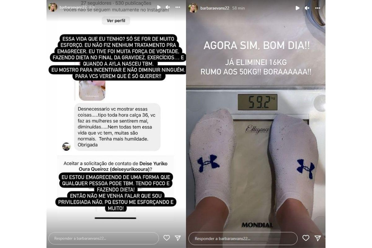 Bárbara Evans usou o perfil do Instagram para responder uma fã, que a acusou de estar diminuindo outras mulheres por estar mostrando a perda de peso. A modelo vem mostrando a rotina de emagrecimento após dar à luz Ayla, e afirmou que faz isso somente para incentivar outras mulheres e não diminuí-las.