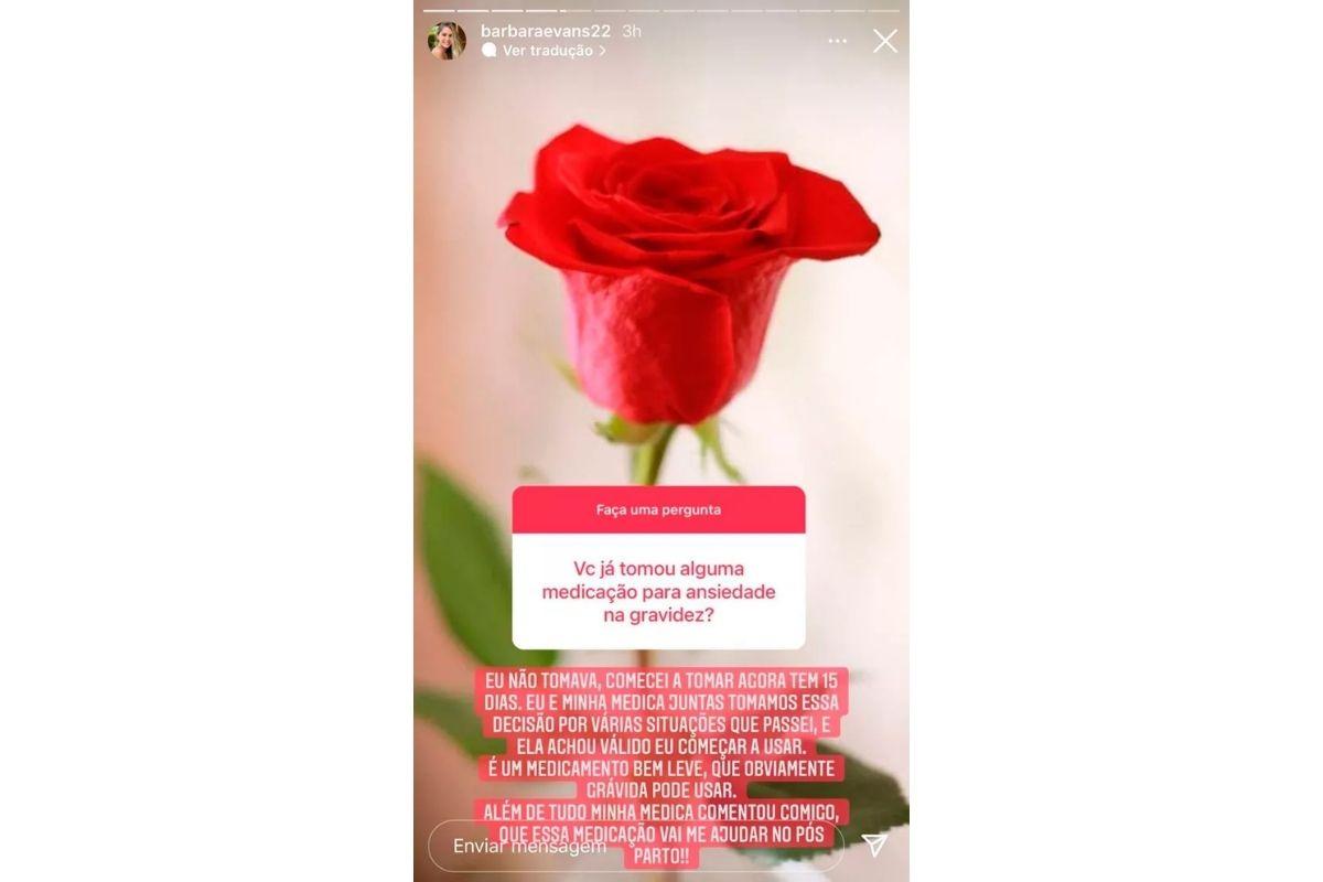 Bárbara Evans contou aos seguidores que começou a tomar remédio para a ansiedade durante a gravidez. Ela está esperando a primeira filha junto de Gustavo Theodoro, e viveu um complicado processo de fertilização in vitro. A modelo chegou, inclusive, a ficar grávida de gêmeos antes de perder um dos bebês.