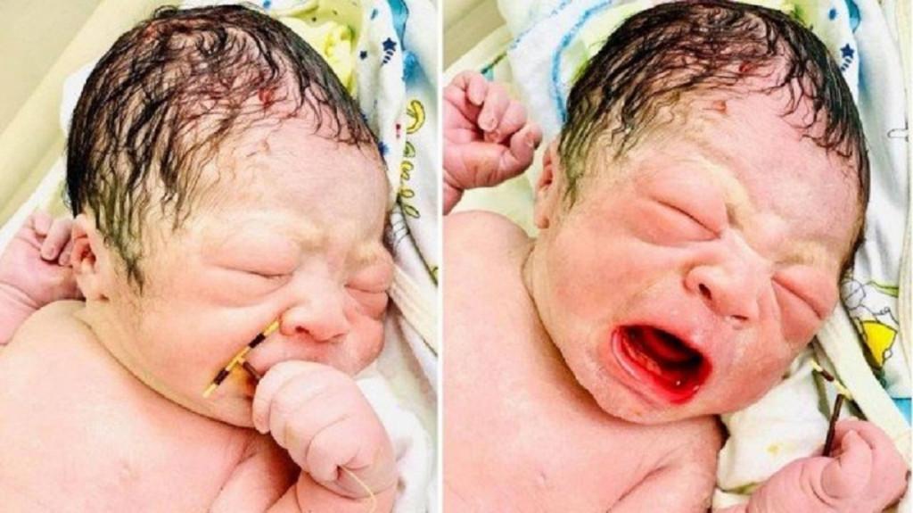 Ao sair da barriga da mãe, o menino segurava o dispositivo intrauterino (Foto: Reprodução / Facebook)