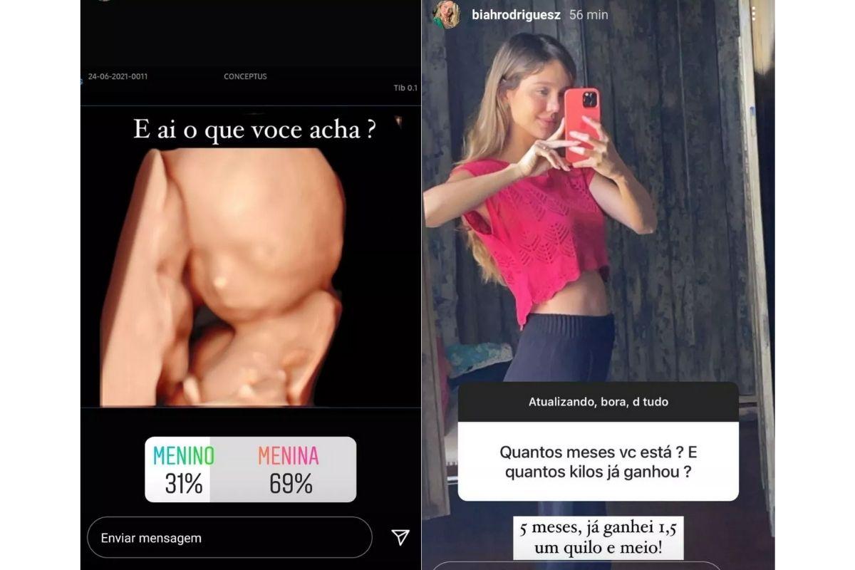 Em uma das caixas de pergunta, um seguidor questionou em qual mês da gestação ela estava e também quantos quilos já tinha ganhado até agora. “Cinco meses, já ganhei um quilo e meio”, respondeu. Além disso, Biah Rodrigues palpitou sobre o sexo do bebê.