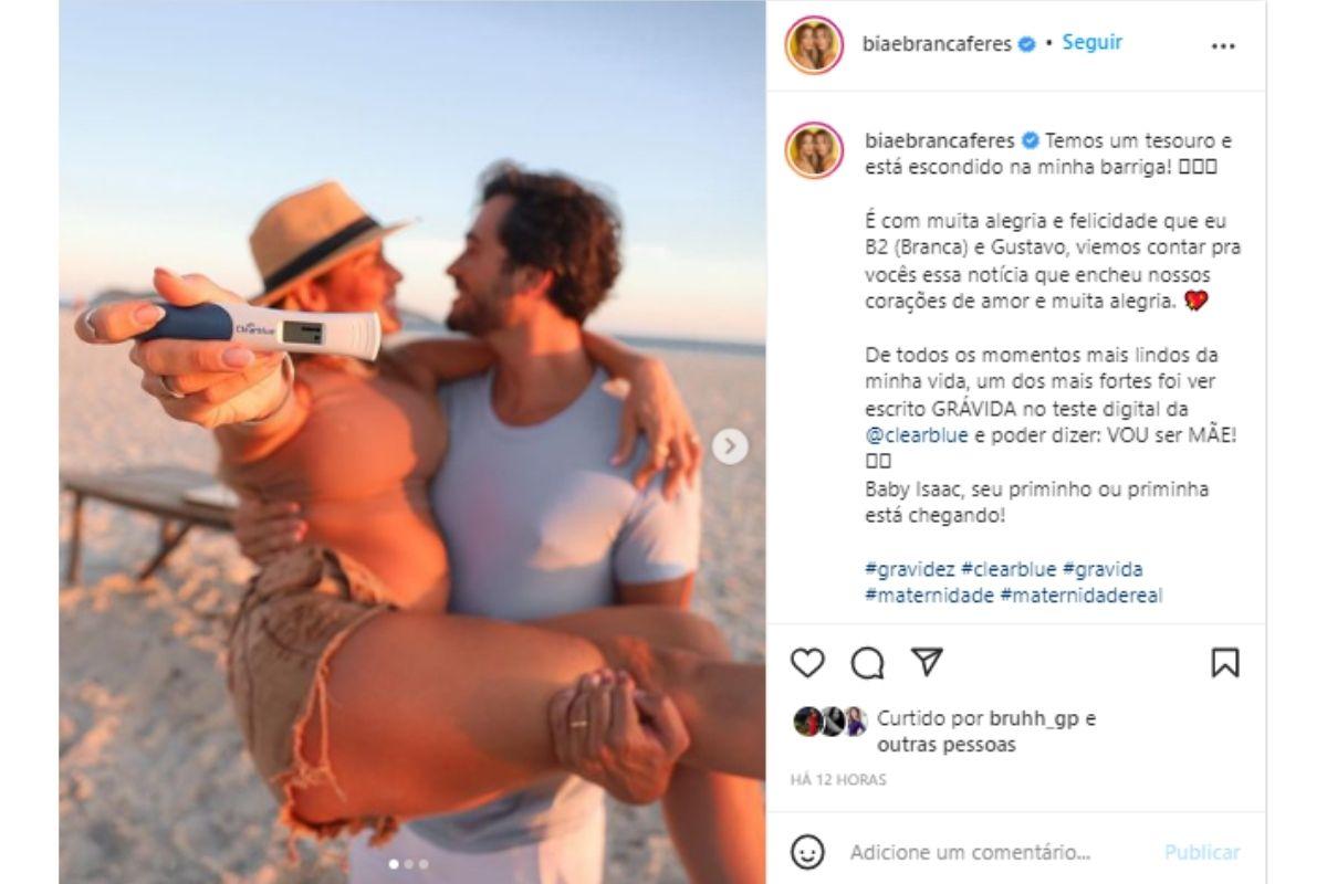 No Instagram oficial da dupla de ex-nadadoras artísticas, Branca Feres comemorou: “Temos um tesouro e está escondido na minha barriga! É com muita alegria e felicidade que eu B2 (Branca) e Gustavo, viemos contar pra vocês essa notícia que encheu nossos corações de amor e muita alegria”.