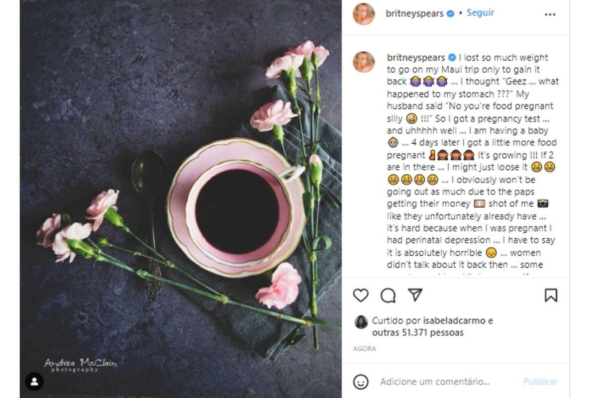 Com uma imagem de um chá, a cantora publicou a novidade em seu Instragram. Na legenda, ela escreveu: “Perdi tanto peso para ir à minha viagem a Maui só para ganhar de volta… pensei: ‘nossa… o que aconteceu com a minha barriga?’. Meu marido disse que ‘não, eu estava grávida de comida’. Então eu fiz um teste de gravidez”, ela começou a contar.