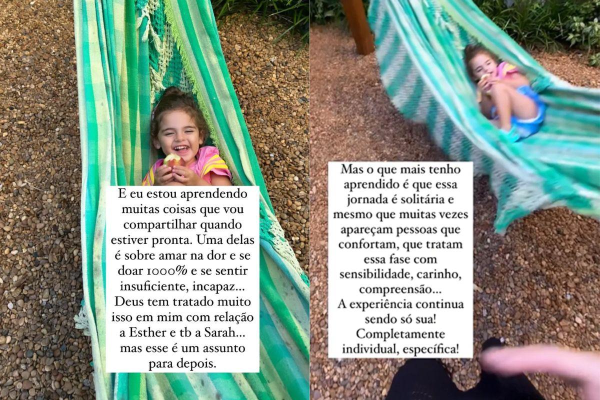 “Deus tem me calado para que eu aprenda muitas coisas com essa gestação, que está sendo completamente diferente… E eu estou aprendendo muitas coisas que vou compartilhar quando estiver pronta. Uma delas é sobre amar na dor e se doar 1000% e se sentir insuficiente, incapaz. Deus tem tratado muito isso em mim com reação à Esther e também à Sarah… mas esse é um assunto pra depois”.