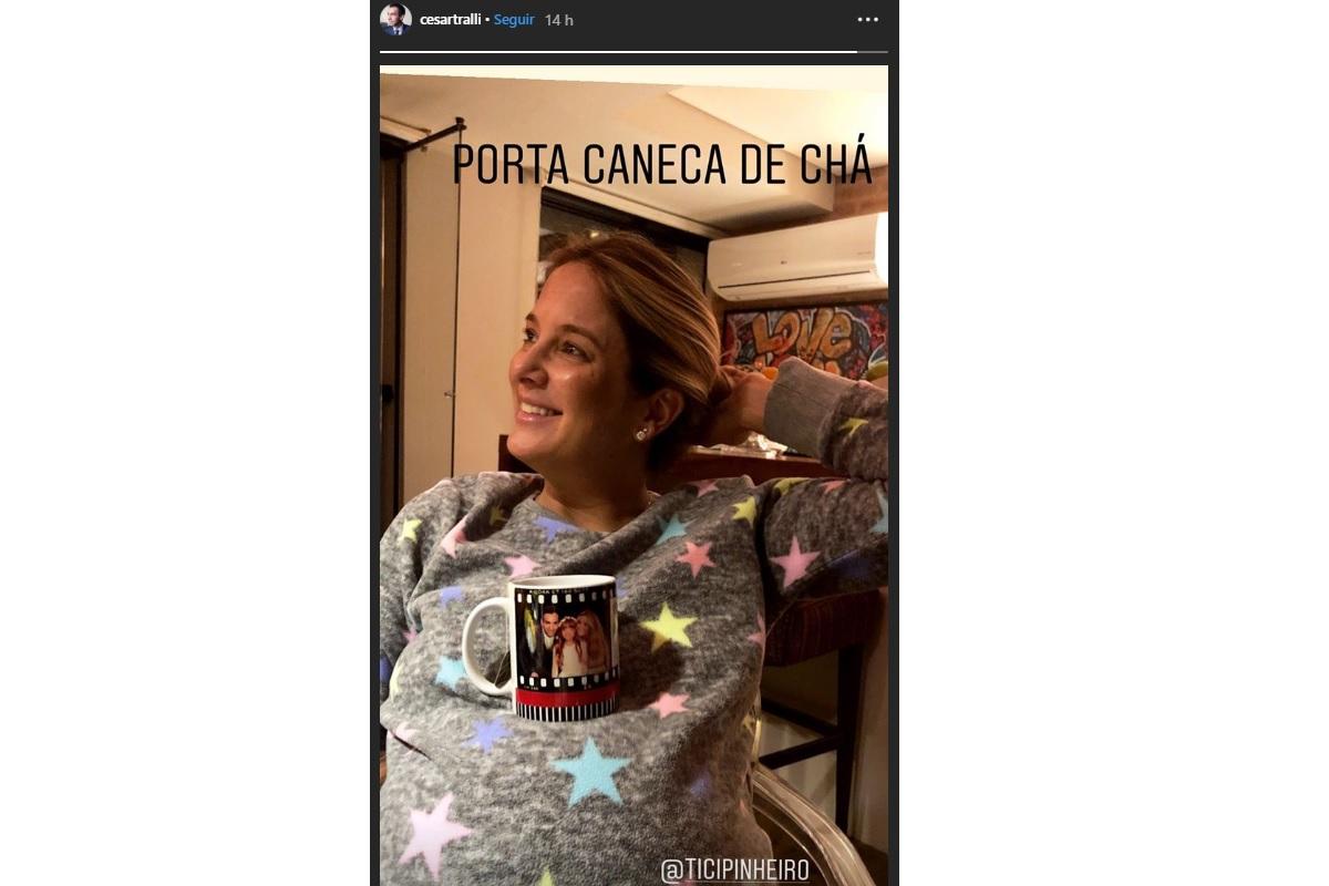 Os dois já estavam em casa e aproveitaram o tempo frio para tomar uma xícara de chá juntos. Mas Tralli, 48 anos, não perdeu a oportunidade de registrar a mais nova função da barriga de Tici, mãe de Rafaella Justus.