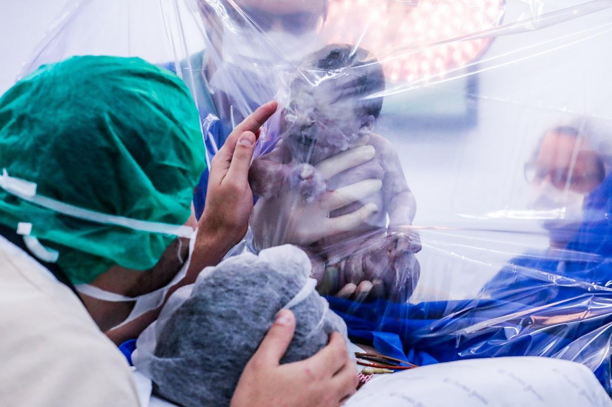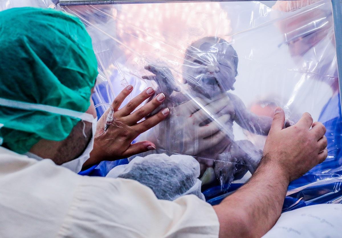 Visualmente, a experiência da mulher com o campo transparente na cesárea se aproxima à do parto normal. E se você está com medo do que pode ver da cirurgia, fique tranquila: não há mais sangue à vista e a você não consegue ver nada da incisão cirúrgica, somente o seu bebê sendo levantado assim que for retirado da barriga. Além de ser muito mais emocionante para os pais e privilegiar a participação da mãe, o novo material usado também rende fotos incríveis. Olha só: